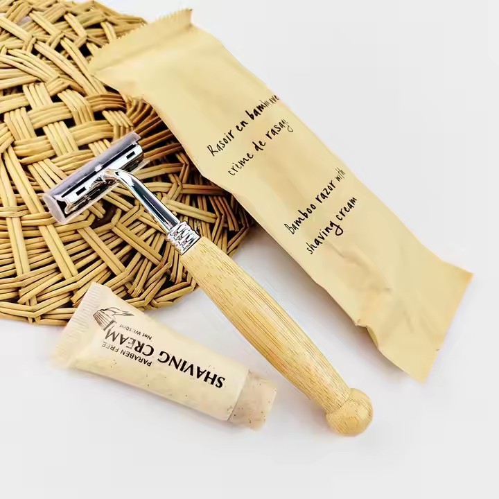 Eco-friendly natural bamboo-handled shaver with 10g wheat tube shaving cream
